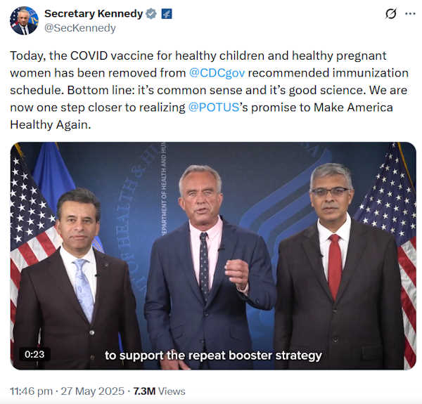 May 27, 2025 – Dr Jack: CDC quietly removed its recommendation for COVID-19 vaccination in healthy children and healthy pregnant women – “only a narrow segment of the population and fails to account for risks that may affect all age groups and health statuses” – REF, CNN – READ, ABC – READ, NY Times – READ