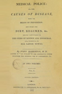 1812 – Medical Police: Or, The Causes of Disease, with the Means of Prevention: and Rules for Diet, Regimen, etc. Adapted Particularly to the Cities of London and Edinburgh, and Generally, To All Large Towns by John Roberton M. D. – READ