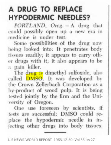 • “Mixed with vaccines or other medicines, DMSO might make hypodermic meedles obsolete…In addition, Jacob and Crown Zellerbach chemist Robert J. Herschler found that DMSO is also a potent pain reliever…”