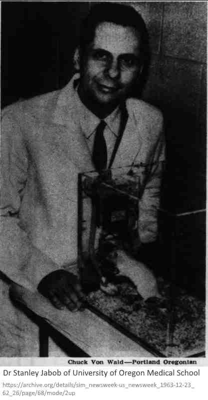 October 1963 – Dr Jabob “presented his report before the Surgical Biology Club”…they thought whe was “ribbing them”. “He offered to report to the Society of University Surgeons; they turned him down” – REF