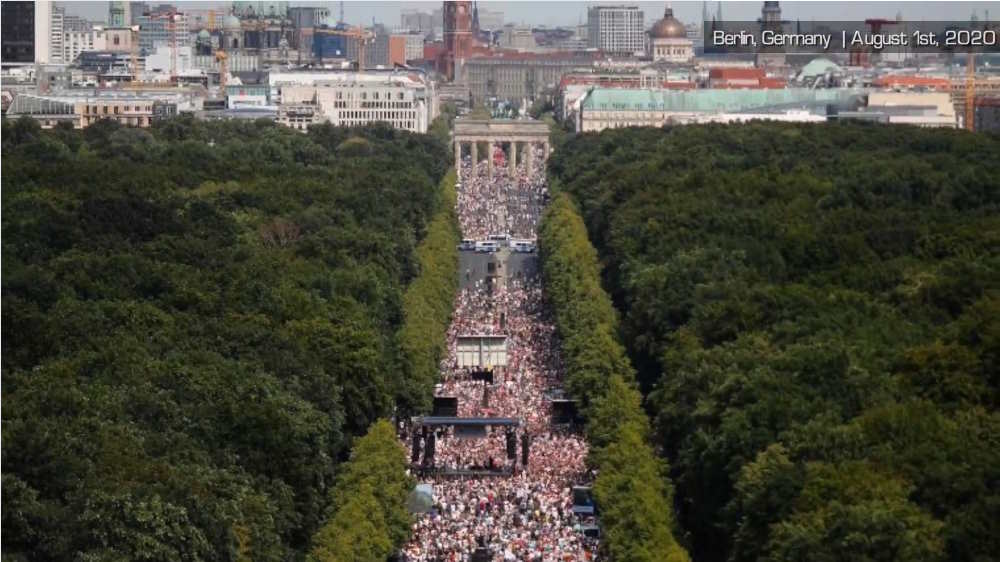 On August 1, 2020 massive rallies broke out in both England and Germany (in fact globally) protesting lockdowns, mask mandates, and the obvious corruption within their government and “trusted” news organisations – overreaching use of “emergency powers”. [@10:40]