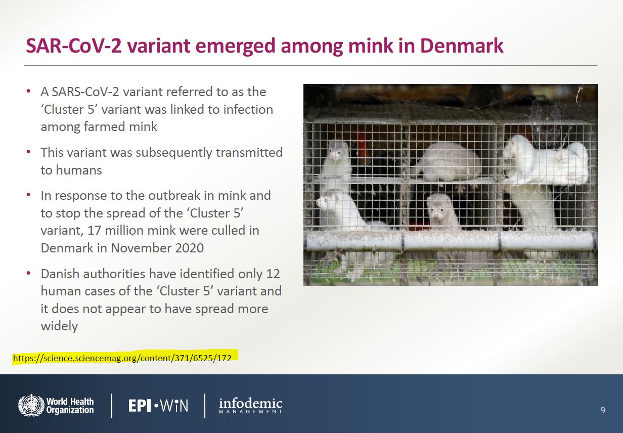 In response to the outbreak in mink of a SARS-CoV-2 variant and to stop the spread of the ‘Cluster 5’ variant, 17 million mink were culled in Denmark. Only 12 human cases were identified. [1]