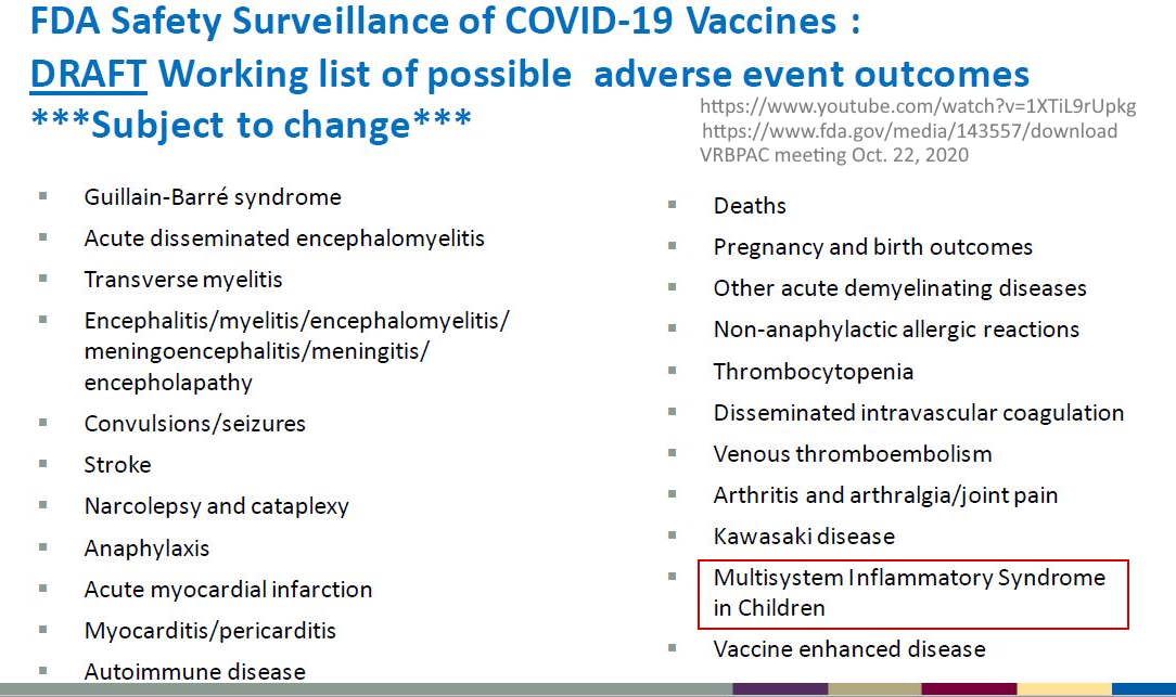 On October 22, 2020 the FDA’s Vaccines and Related Biological Products Advisory Committee (VRBPAC) member revealed in the public meeting on slide 16 entitles ‘Draft working list of possible adverse event outcomes’, the potential risks associated with these COVID-19 vaccines, including a completely new category of disease “multi-symptom inflammatory syndrome in children”. [1]