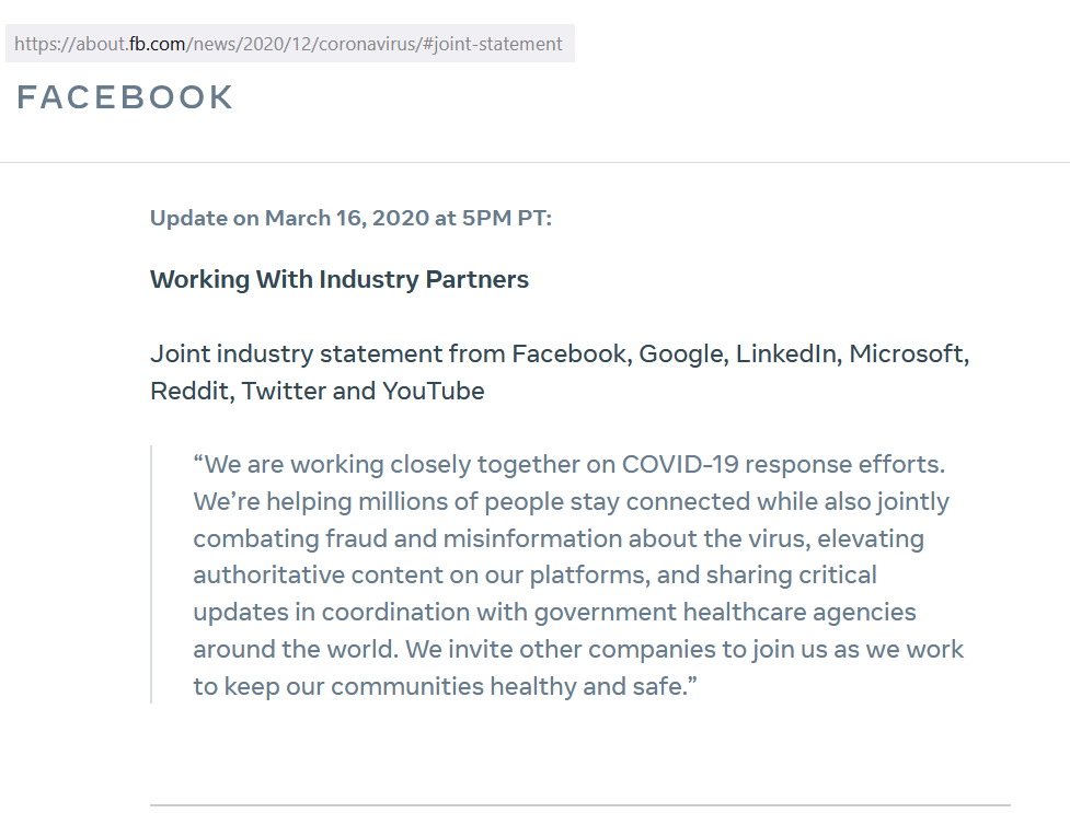 Big Tech giants (Facebook, Google, LinkedIn, Microsoft, Reddit, Twitter and YouTube) released a joint industry statement aimed at “combating fraud and misinformation about the virus”, elevating “authoritative” content (WHO, CDC, HHS) on their respective platforms, and the sharing of critical updates in coordination with government healthcare agencies around the world.