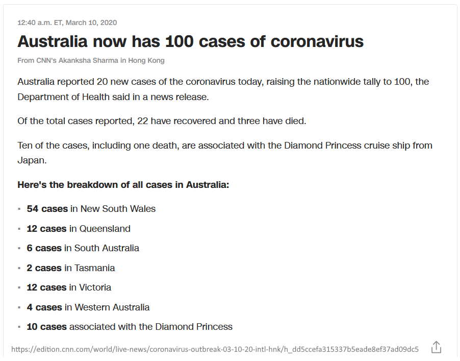 On March 10, 2020 Australia reports 100 cases of COVID-19 (referred to all over the news by the family name of the group of viruses – “coronavirus” and not the disease name COVID-19).