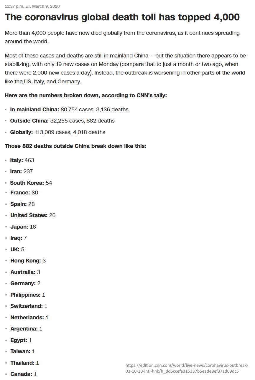 The global death toll attributed to COVID-19 has topped 4,000, of which 882 are outside of China. [2]