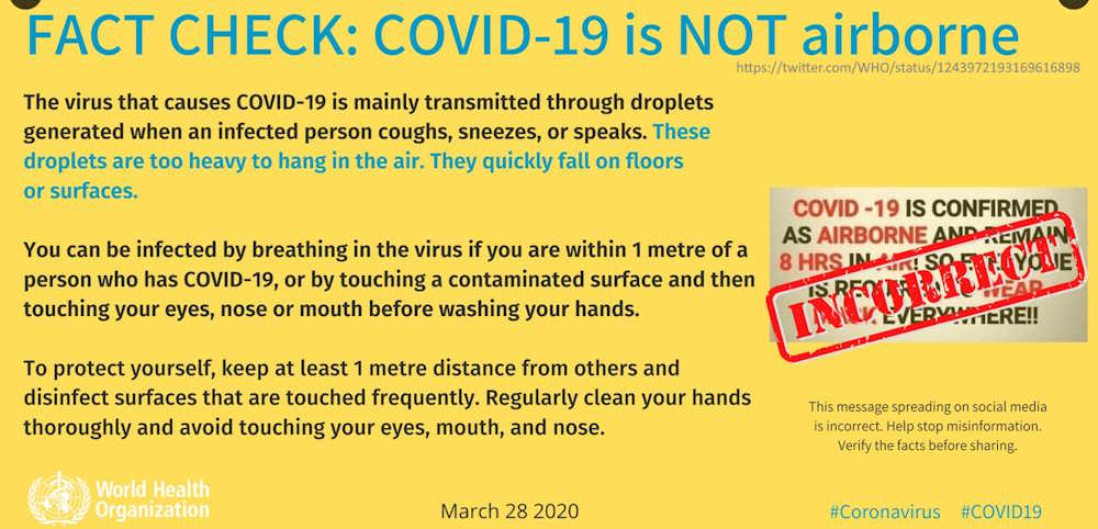 WHO claim as “fact” COVID-19 is NOT airborne – stay 1 metre apart