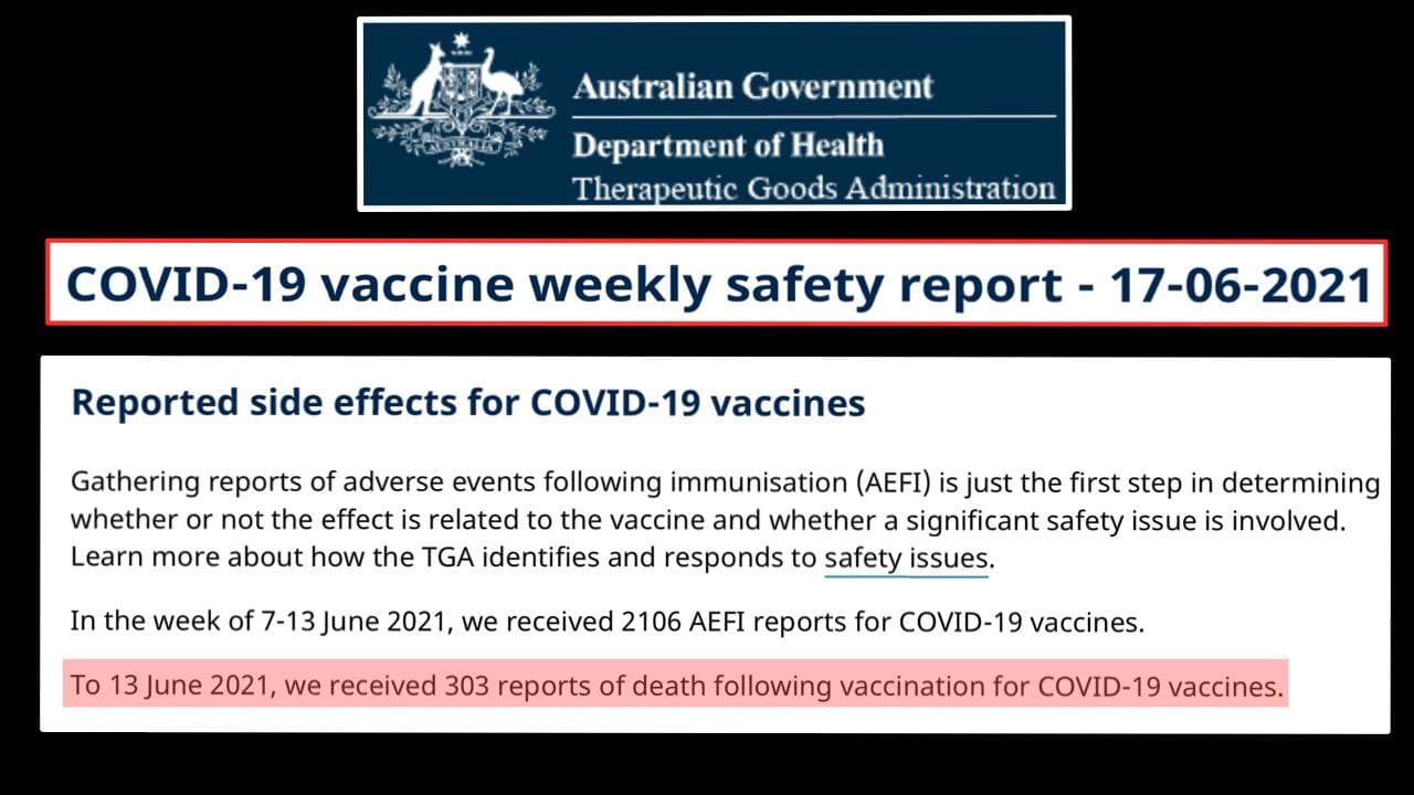 The TGA DAEN reporting system has received 303 death reports to date. A report doesn’t mean causality, but number of reports are alarmingly high. DAEN is a passive reporting system, and Australian doctors have been deterred from attributing a post vaccination adverse event have any association to the product, even though the TGA requires all events to be reported under provisional registration status.