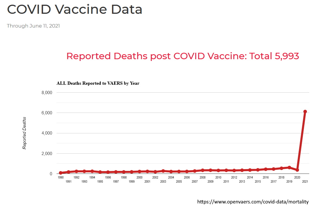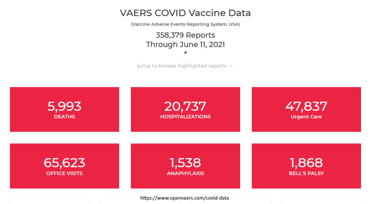 To date (June 11, 2021) the US VAERS, passive vaccine injury reporting system, has received 5,993 deaths following COVID-19 vaccinations.