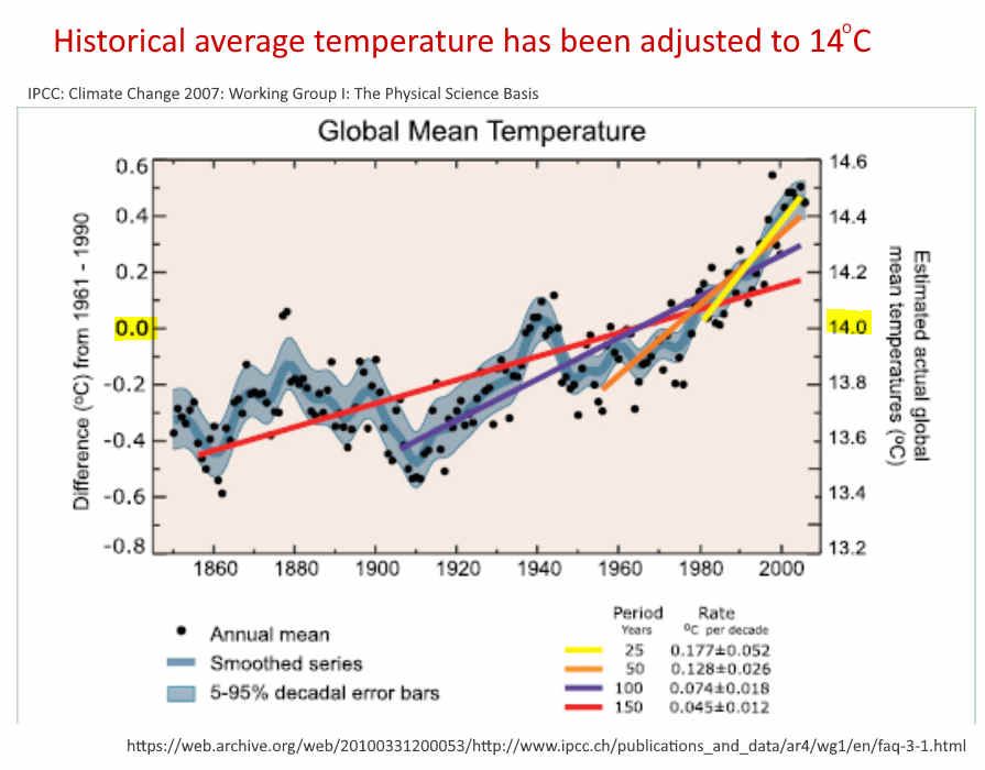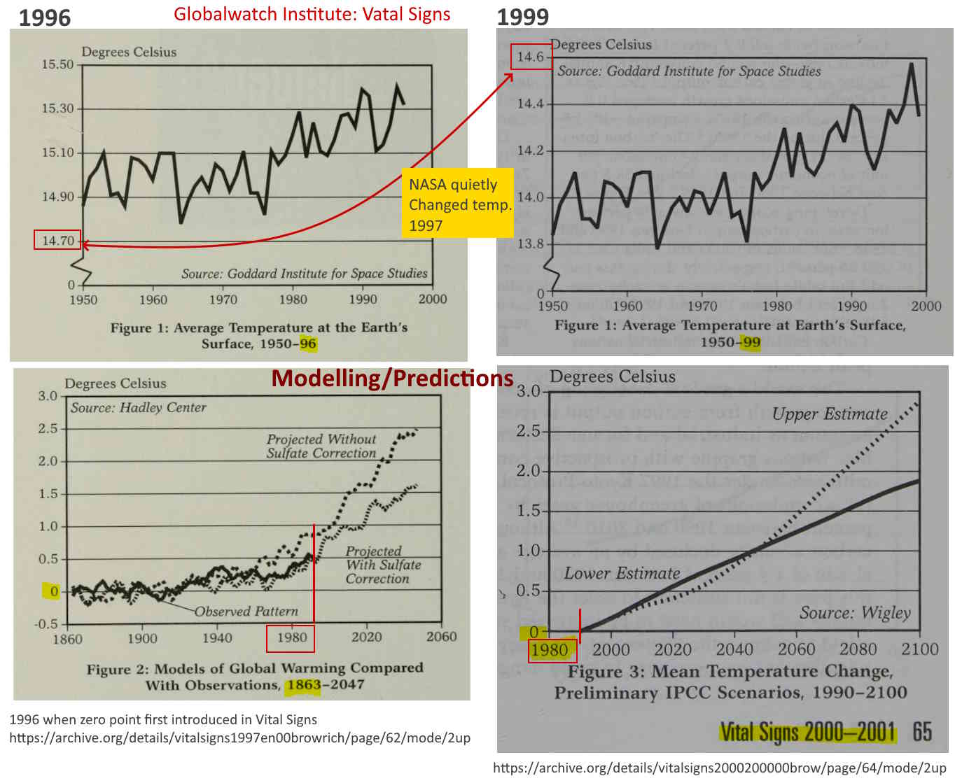 “As it turned out, the average temperature of 15 degrees Celsius was an inconvenient value that did not support the allegations of global warming.” On January 18, 1998, James Hansen, via an email to Worldwatch Institute, “the leaders of the global warming movement” told them that a “better base number” would be 14 degrees C. Around this time a zero point started to appear in the graphs, and has done since in IPCC reports. [2, 3]